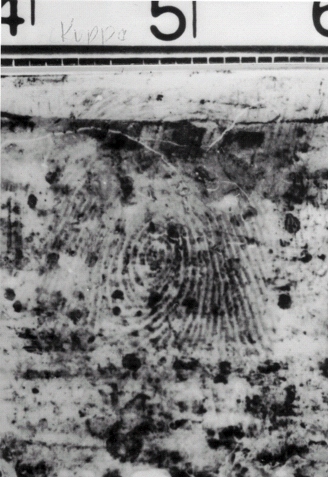 ![]() Diese klassifizierbare Täterspur wurde am unteren Fensterfries des Zimmers Grandel gesichert |